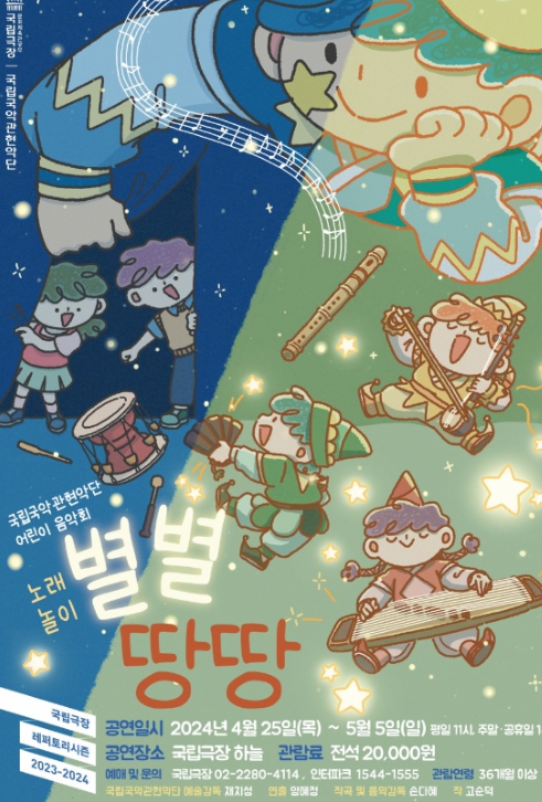 ● 국립국악 관현악단의 어린이공연으로 올해로 20년째를 맞이합니다. 이번에 새로 선보이는 2024년 공연은 국립국악관현악단만의 어린이 공연 제작 노하우가 담긴 작으로 , 관객들이 직접 작품에 참여하여 스스로 즐길 수 있도록 만들었습니다. 연극놀이 전문가로 활동중인 연출가 양혜정과 국립 국악 관현악단이 만나 새로운 차원의 어린이 음악회입니다.