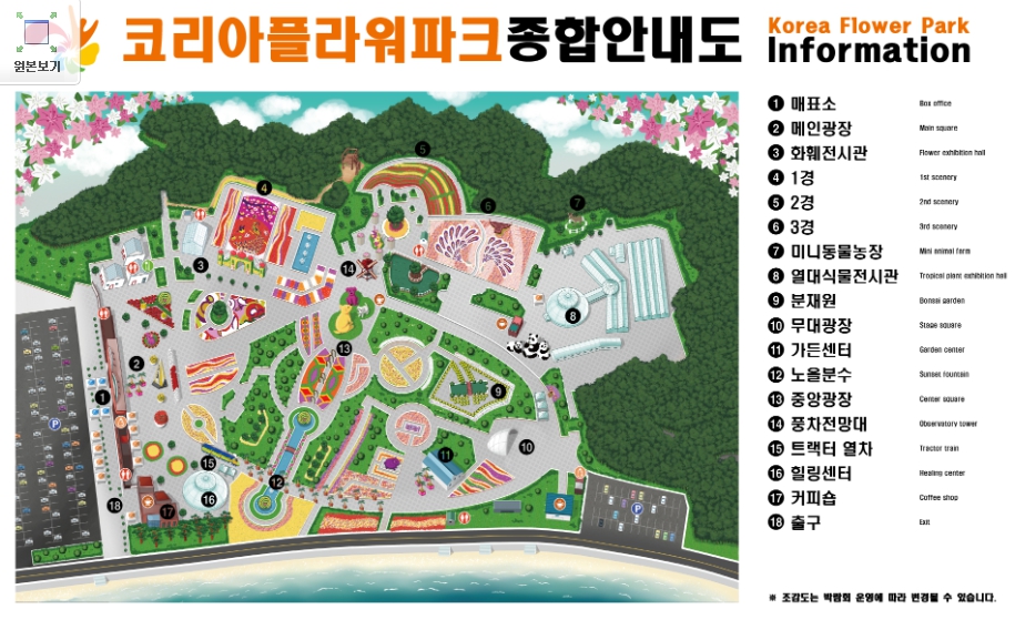 코리아 플라워파크는 면적이 축구장의 5배에 달하는 면적이라서 걷기가 힘든 노약자나 어린이가 동반할 경우에는 전동차를 운영하시면 좋을 것 같습니다. 이용요금은 성인 3,000원 청소년 2,000원입니다